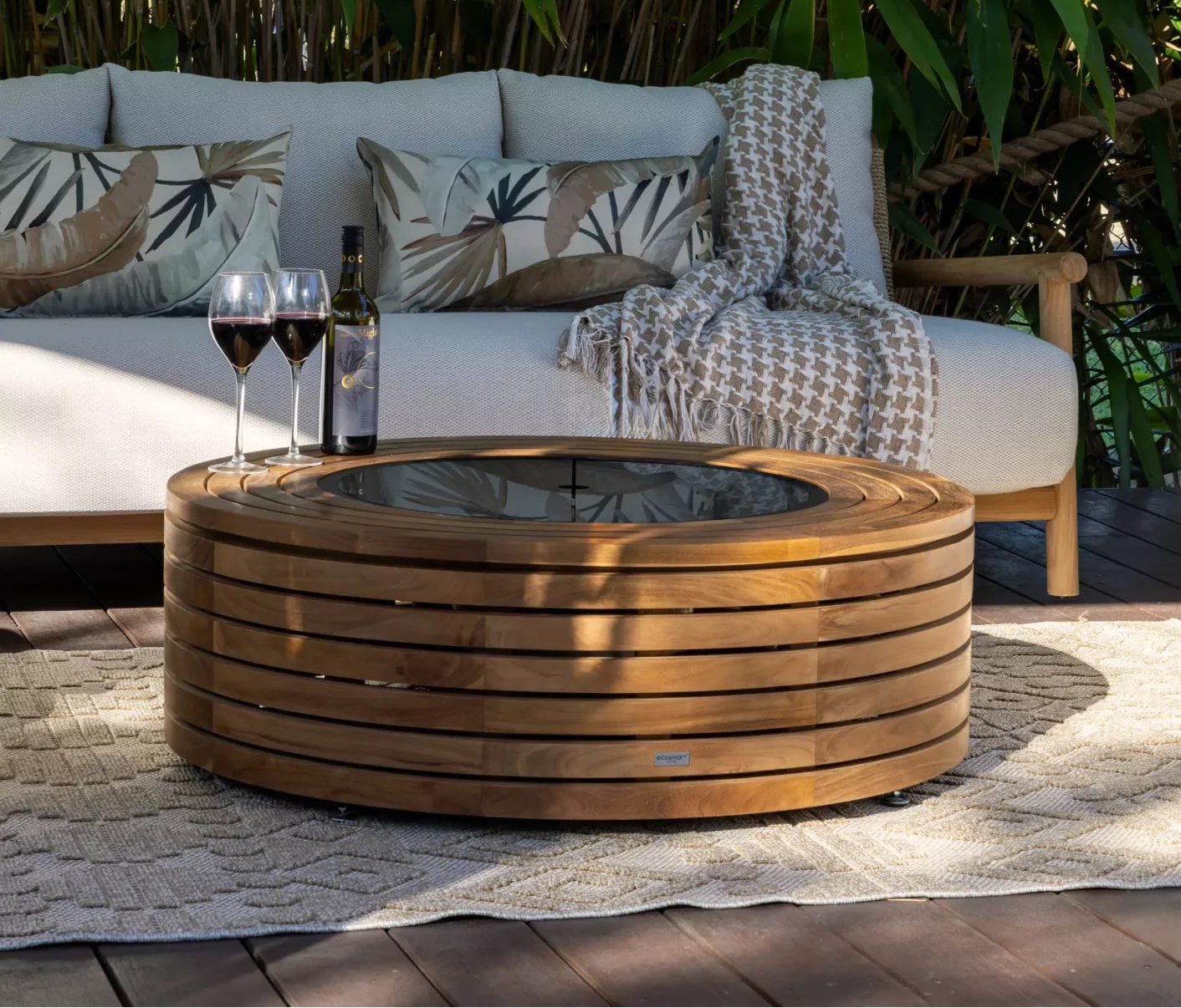 "A sleek toughened glass cover that transforms your fire pit table into a smooth, functional coffee table surface when the fire isn’t in use."