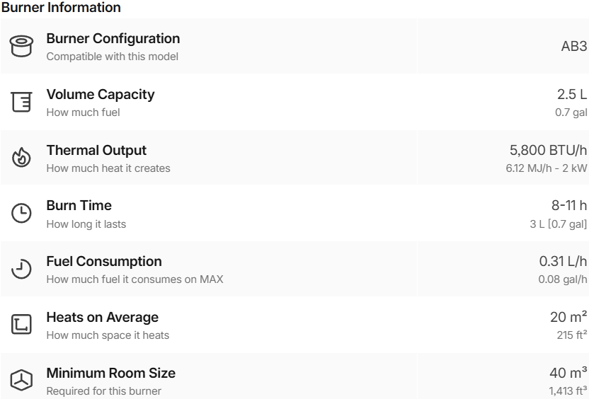 The Ghost centres around the AB3, a 2.5 litres capacity ethanol burner that has a burn time of up to eight hours. Though one of the smaller units in the Designer Range, the Ghost has the ability to warm rooms up to 20 square meters. An optional glass windscreen is also available.