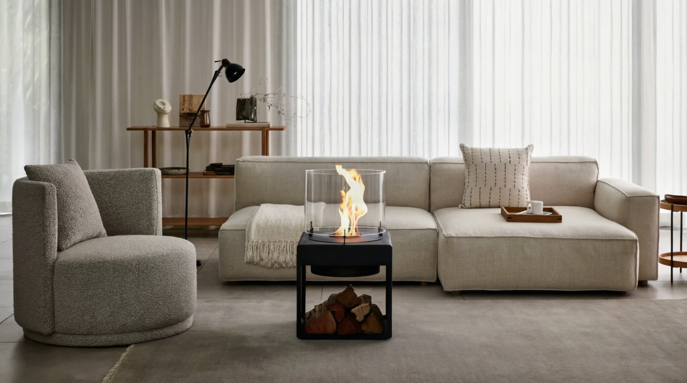 A cylindrical glass screen surrounds the round AB8 burner, ensuring a stunning 360 degree view of the larger scale dancing flame, with the void beneath the burner providing a space for decorative items.