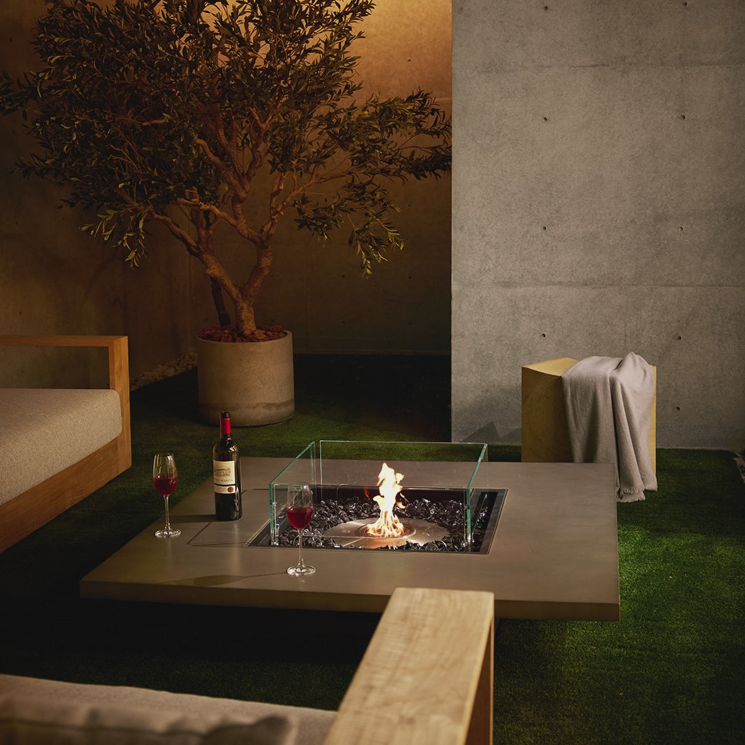 Form and function combine in this contemporary eco-friendly fire pit table to give a real presence to indoor and outdoor lounge settings. Its low-set, square-shaped design with ample proportions for setting down food and drinks ensures the Vertigo 50 fireplace makes a stunning design statement while ensuring practicality for entertaining purposes. Works perfectly for larger lounge settings, with the square base providing myriad options for positioning multiple armchairs around the fire, or using a combination of loveseats and single seaters or ottomans to personalize your living space.